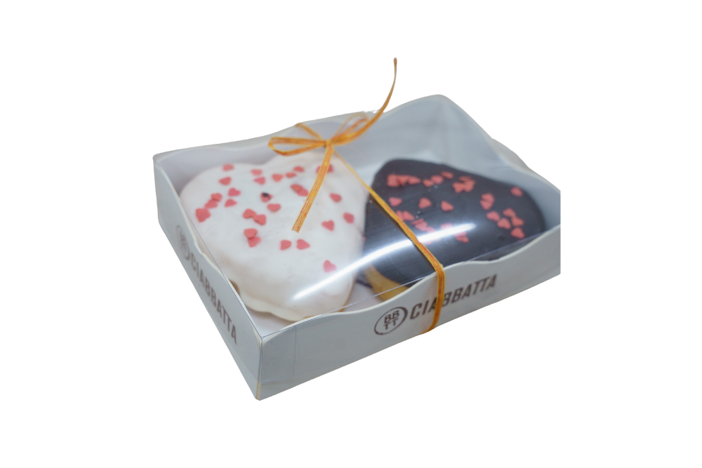 Pack especial de San Valentín con dos berlinas esponjosas: una cubierta de chocolate negro rellena de crema de cacao y otra cubierta de chocolate blanco rellena de fresa.